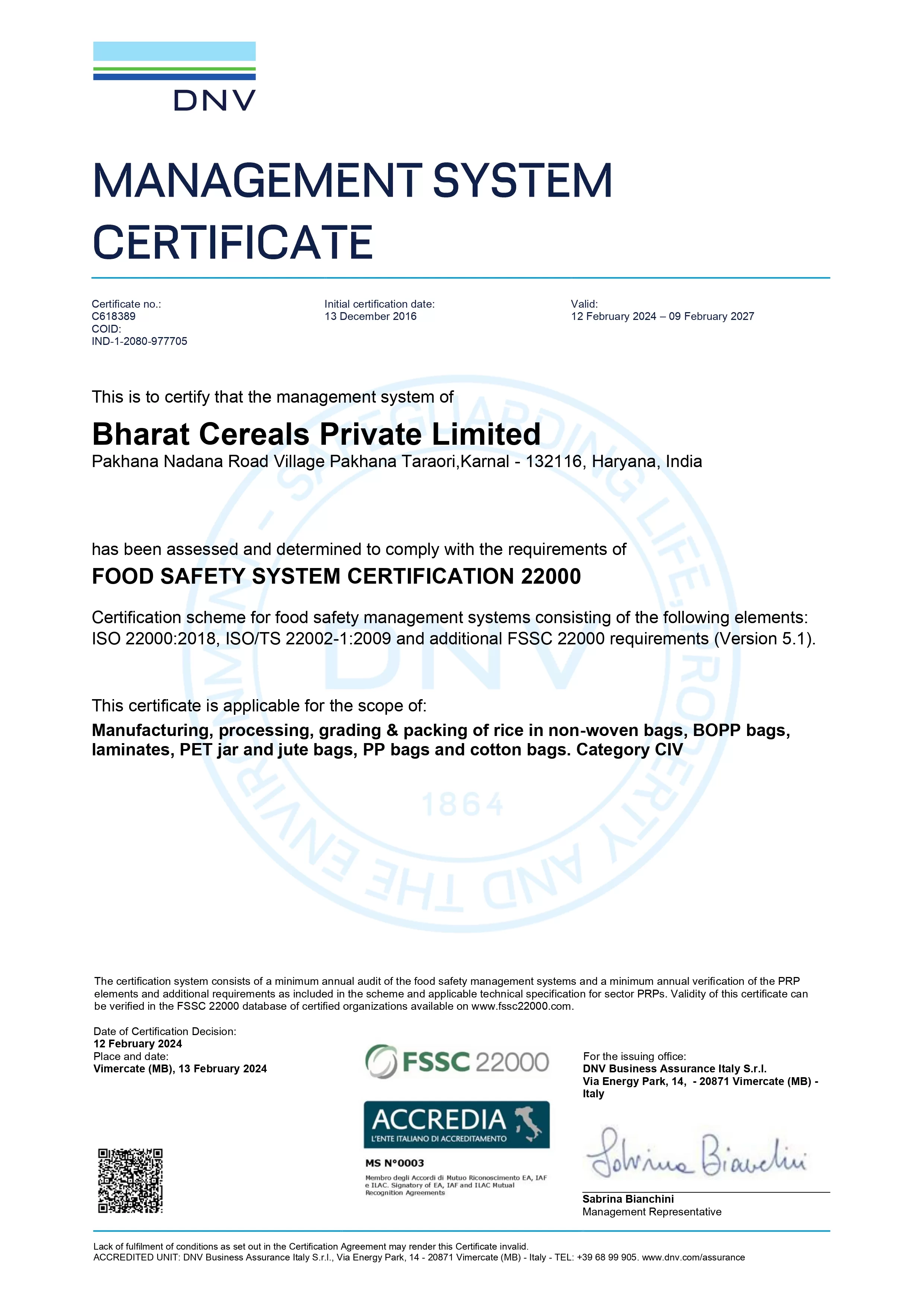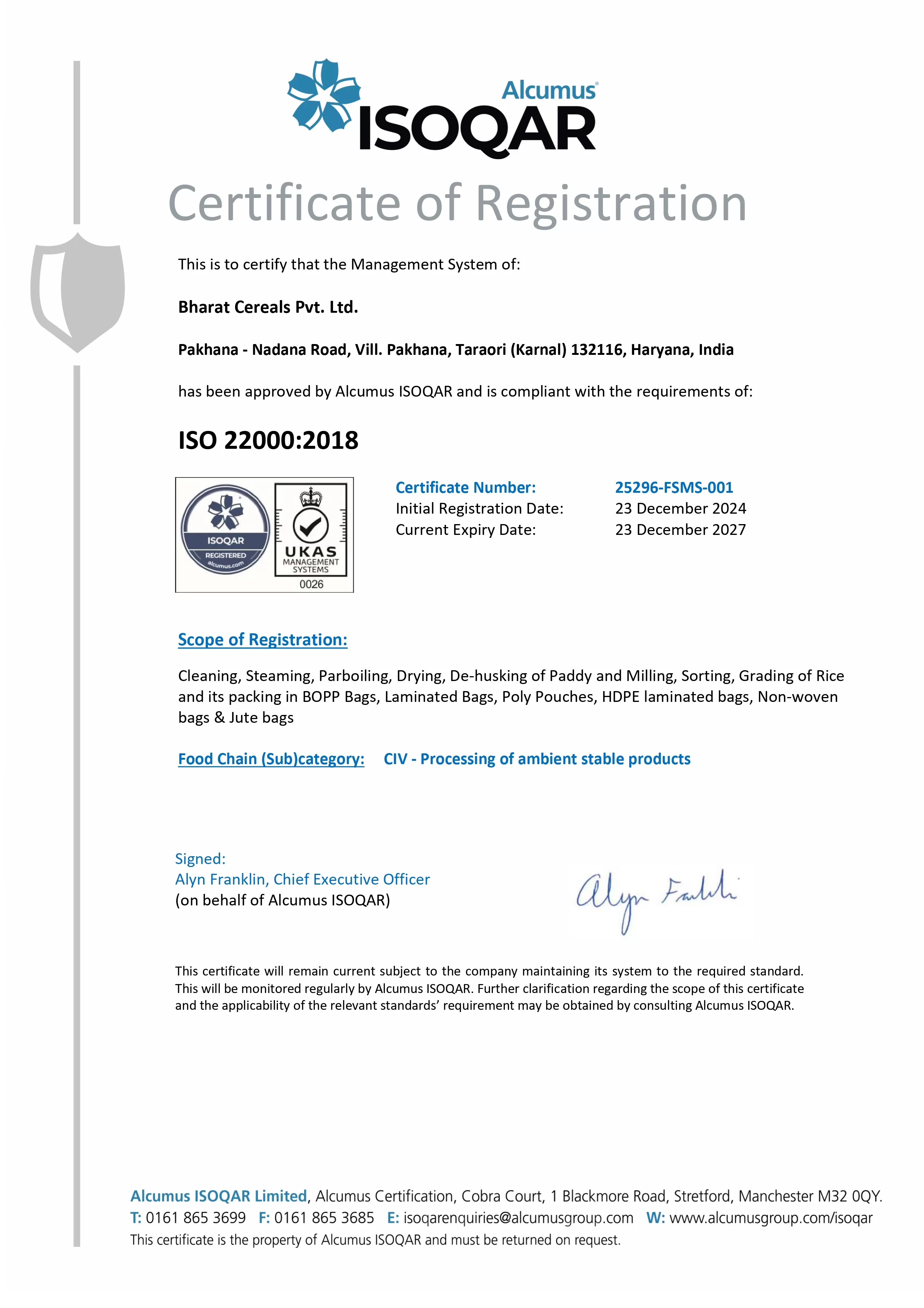 ISO 22000:2018 CERTIFICATE