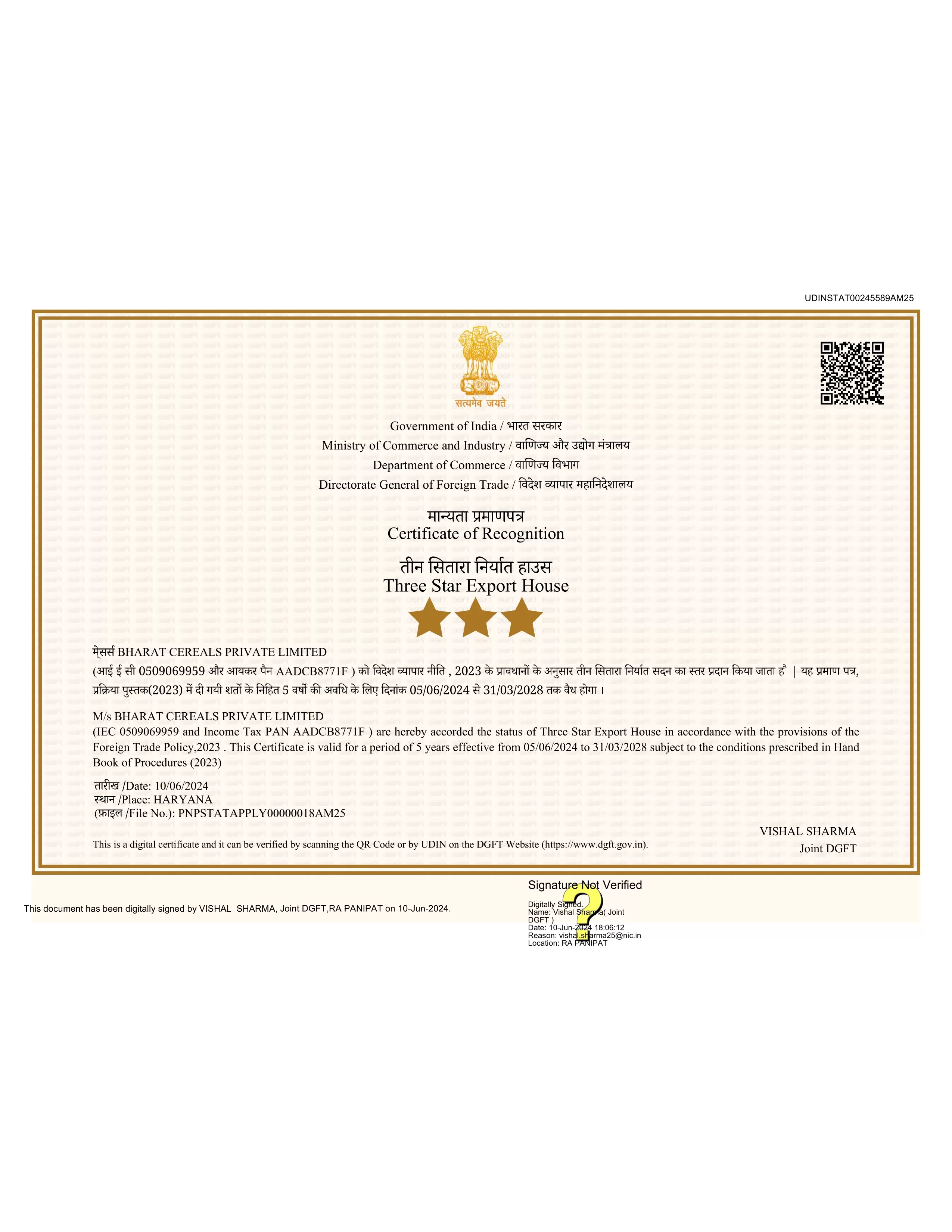 THREE STAR EXPORT HOUSE CERTIFICATE